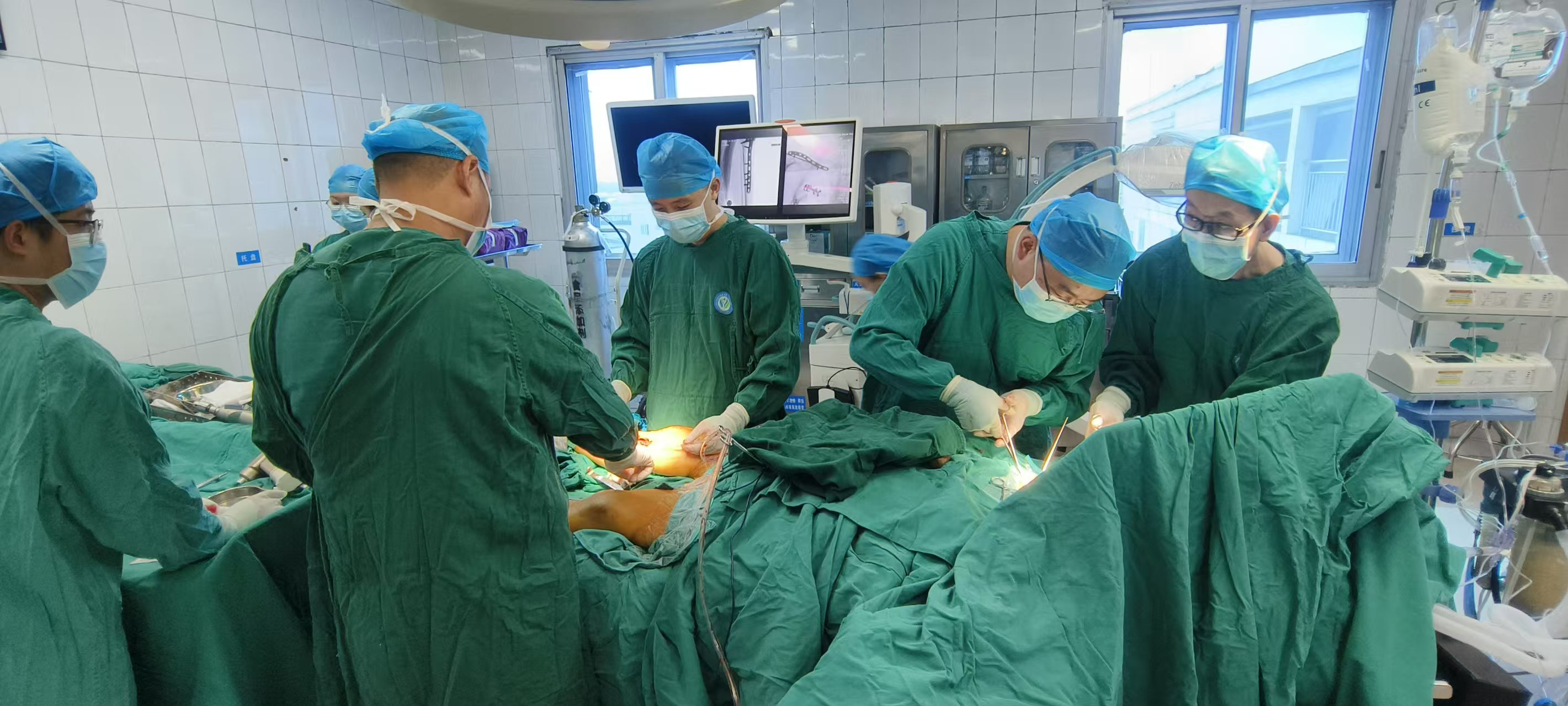 待生命体征平稳,骨科团队接下“硬骨头”——患者双侧下肢四大关键关节(双膝、双髋相关部位)同时严重骨折,且74岁高龄伴随骨质疏松、愈合能力差,手术难度堪称骨科“禁区”。10月10日,以骨科主任王俊义为首的专家团队,在精准麻醉护航下开展“双股骨、双胫骨平台、右锁骨骨折切开复位植骨钢板内固定术”,医生将粉碎骨块精细复位以重建关节面平整,通过植骨(植入骨组织促进骨骼愈合)搭建“内部支架”,再用钢板螺钉系统固定,为术后康复提供力学保障。历经一场“马拉松式”手术,复杂骨折重建顺利完成。
